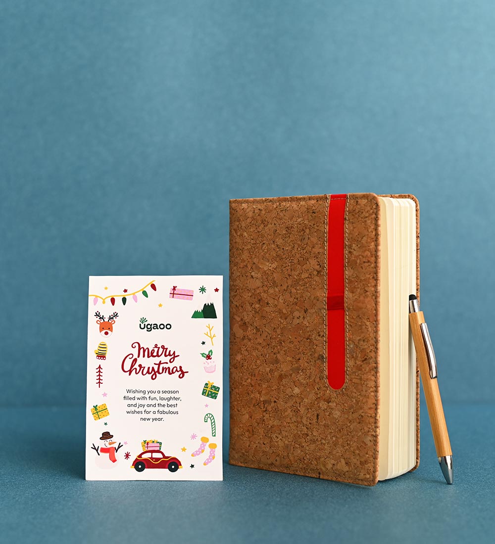 - Cork Eco-friendly A5 notebook with Colored pen slot - Hard bound cover - With memorandum and Bookmark ribbon- 80 gsm sheets - 160 undated pages